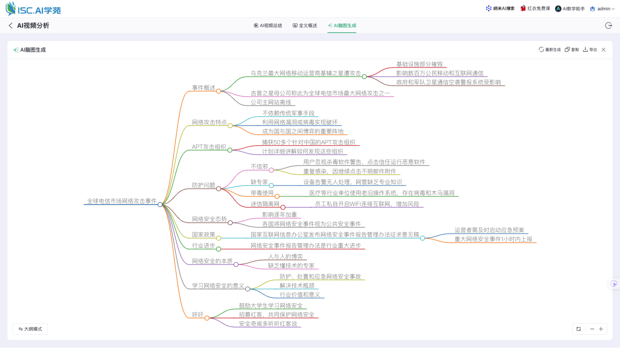 针对网络安全和AI技术视频课程,AI引擎能够根据主题结构进行多维度提炼,涵盖理论知识、实战技巧、案例分析等,最终形成全文摘要。