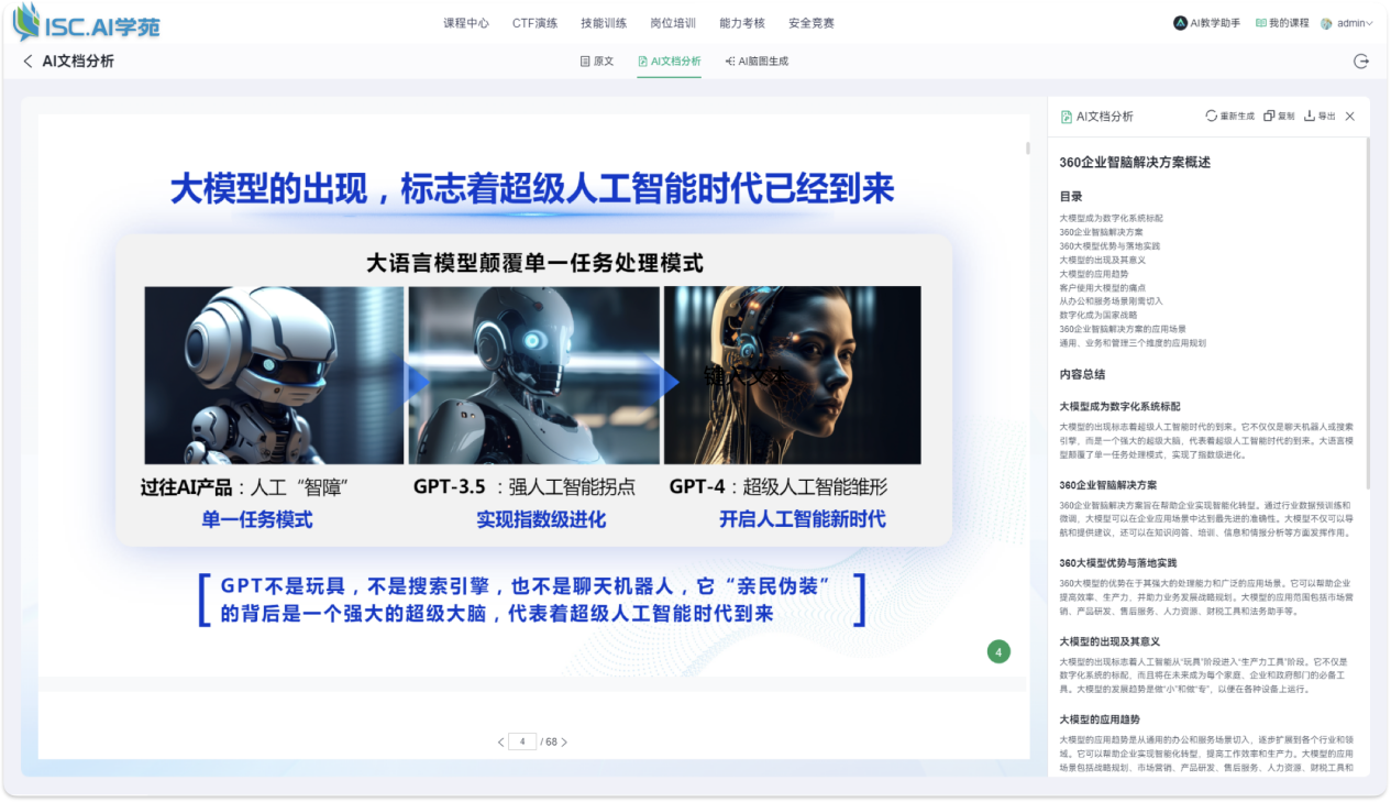 利用360通用大模型能力对现有教学视频进行智能分析,提取视频中的核心内容,自动标注时间点,支持快速跳转功能,总结课程全文摘要,方便学员快速浏览精华内容,提升学习效率。
