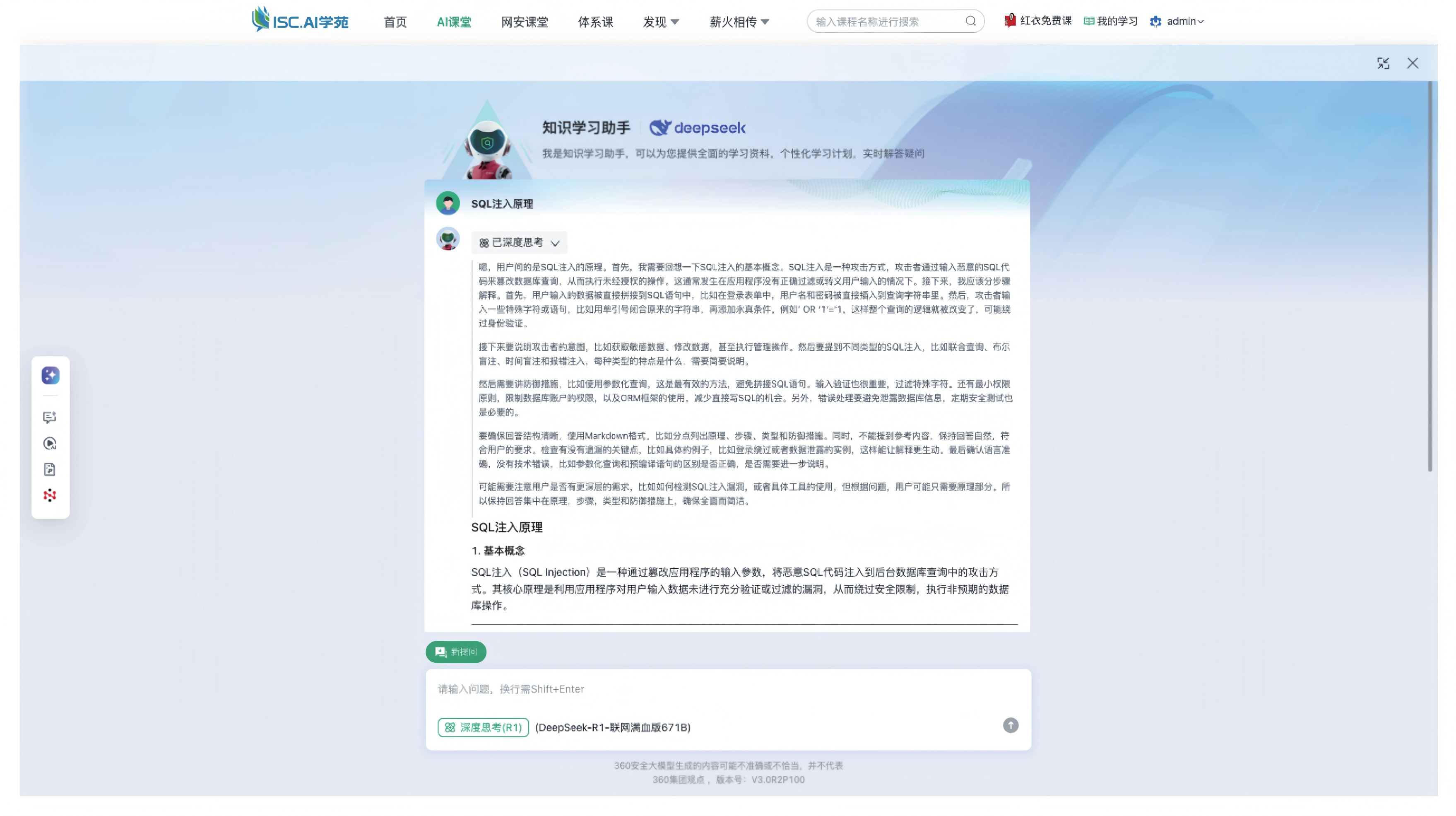 依托安全大模型的深度学习和知识推理能力,平台率先推出AI知识问答功能,为学员提供实时精准的技术 解答与学习支持。通过大模型对网络安全领域的海量知识库进行整合和语义理解,不仅能够快速响应学员的问 题,还能依据问题难度和上下文关系提供详细的讲解与相关资源推荐。