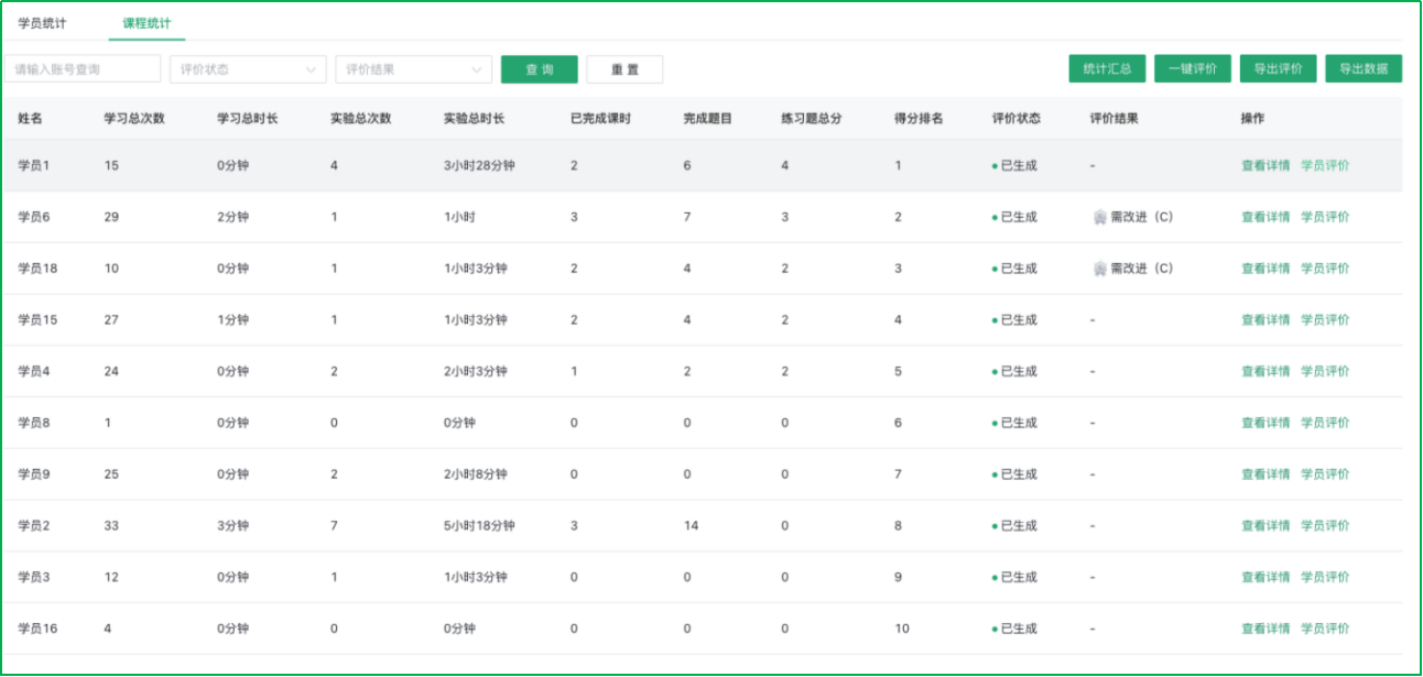 通过实时追踪学员的学习进度与行为,全面记录学习过程中的每个关键节点,并结合学员表现进行智能评价。系统能够根据学员的学习数据,自动分析学习效果,提供个性化的反馈与改进建议,帮助学员发现薄弱环节,优化学习路径。