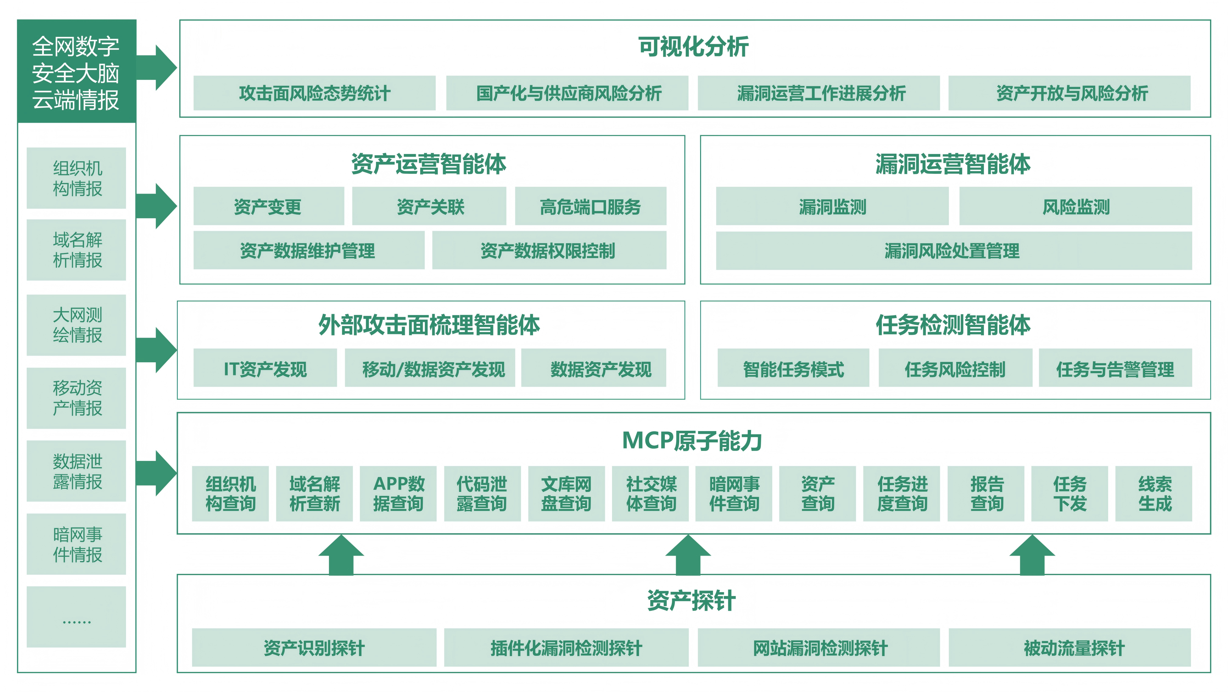 360攻击面分析智能体基于AI重塑攻击面管理,结合360强大的情报体系,自动化、智能化梳理用户外部攻击面现状,同时结合AI能力,构建智能化资产运营体系,帮助用户看清风险,推动政企智能资产运营体系建设。