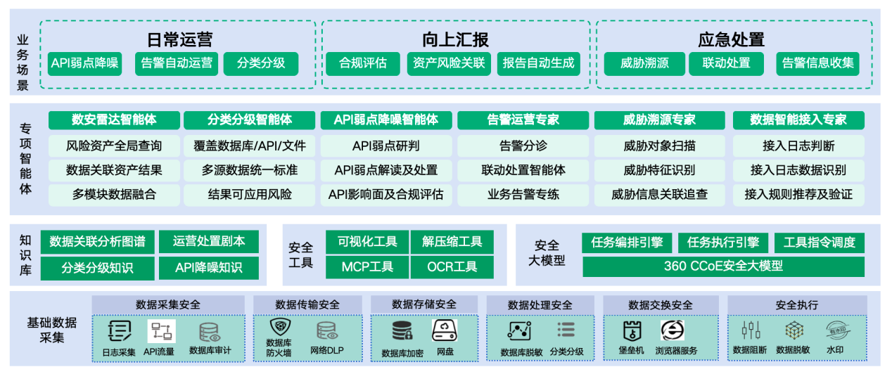 360数据安全智能体专注服务于数据安全风险识别、分析、处置、汇报全流程的AI智能体体系。针对企业在数据生命周期中面临的“风险难确认、问题难溯源、报告难生成、响应不及时”等核心挑战,构建“日常运营、向上汇报、应急处置”三大典型场景,集成多类智能体能力,构建全场景智能响应机制。