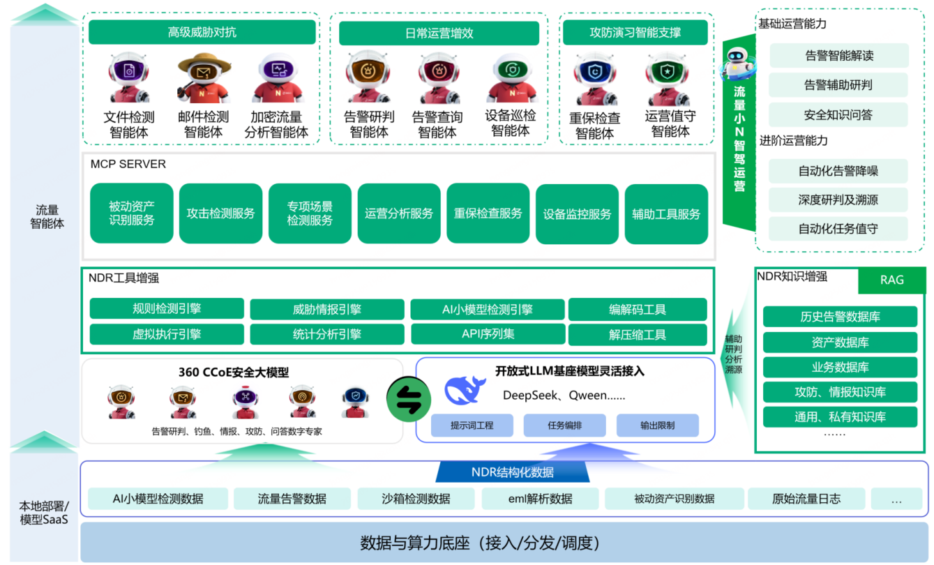 360流量检测智能体出厂即带算力,在深度集成360NDR流量威胁检测引擎与服务的基础上,内嵌多个专项检测AI小模型,以流量检测为入口,依托360安全大模型、360数字安全专家矩阵支撑,精准强化勒索挖矿、钓鱼邮件、加密攻击等高级威胁检测能力。同时,产品内置小参数蒸馏模型、支持接入多种开源开放式LLM基座模型(如:Deepseek、Qwen等)、外部API、私有知识库,通过“流量小N”运营助手可以灵活调度智能体实现日常运营及告警分析,通过订阅360安全大模型辅助深度研判及分析溯源。