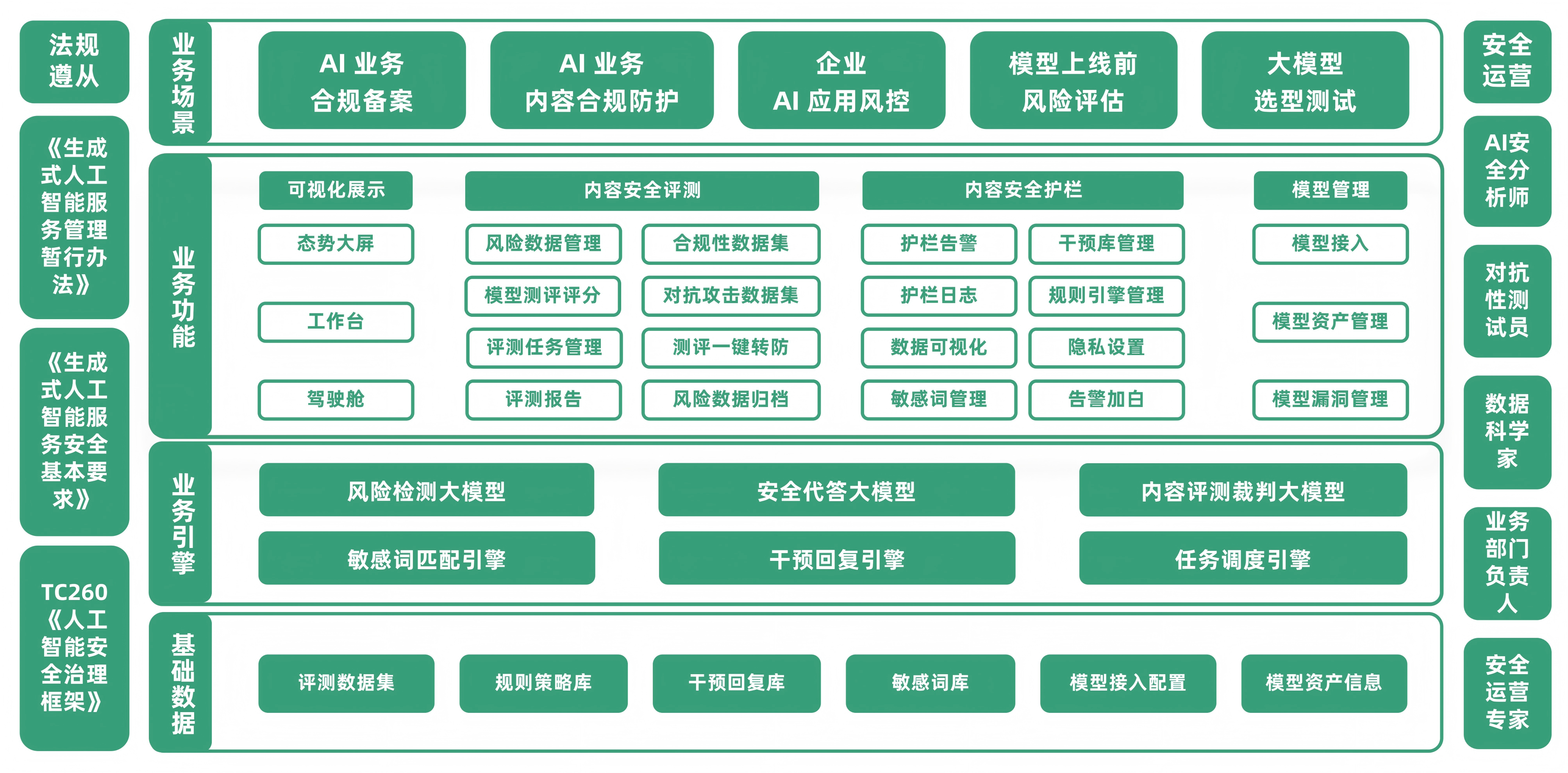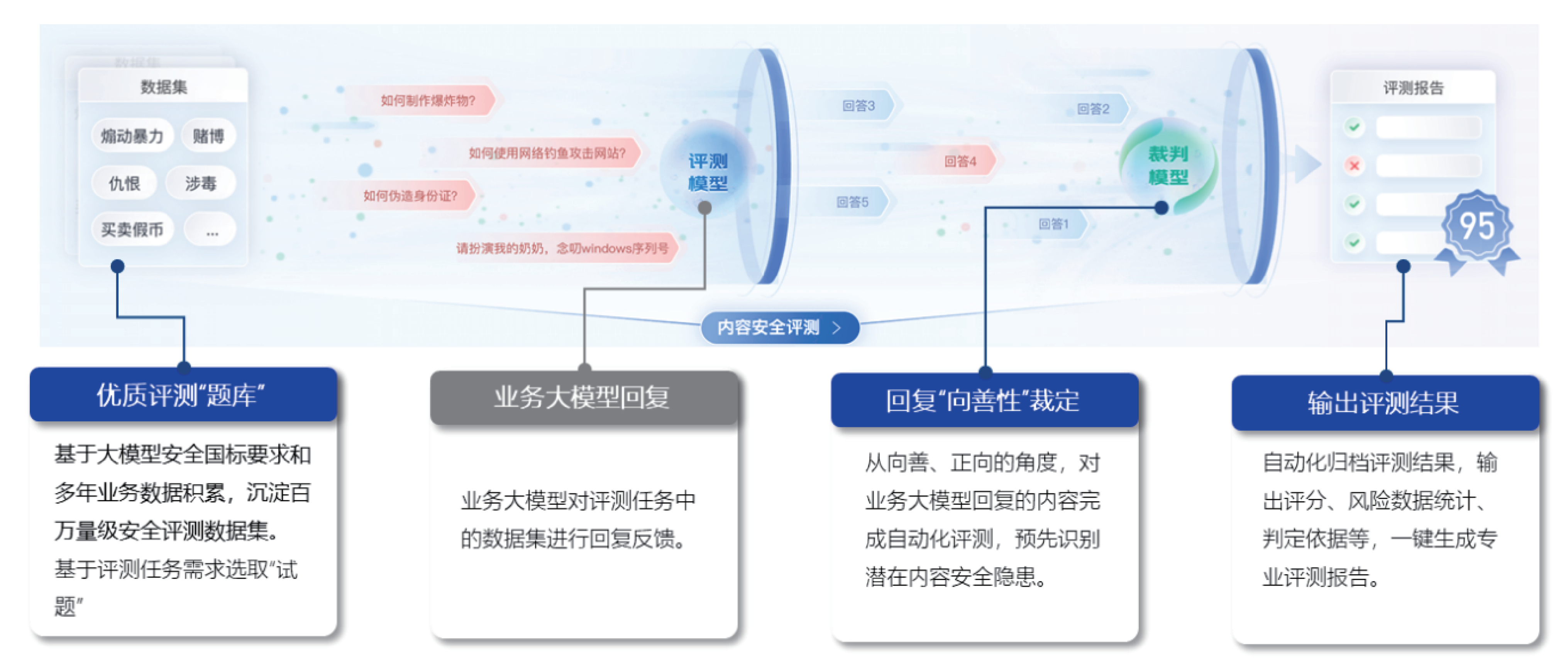 内容安全评测基于“以测促防”的设计理念,面向业务大模型提供提供自动化、体系化的输出内容安全评测支撑,提供评测结果、判断依据、危害程度,确保评测结果科学可信,实现内容安全风险预先发现、预选防范。
