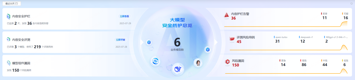 工作台用于呈现大模型内容安全防护全貌,涵盖内容安全防护告警、内容安全评测模型得分、接入模型情况等核心统计信息,为运营人员提供统一运营入口。