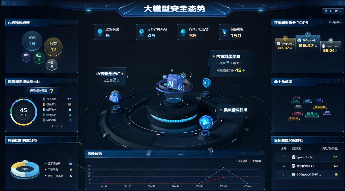 2025年8月:基于“智盾”核心能力迭代升级,360大模型卫士防护系统正式发布,筑牢大模型内容安全防线。