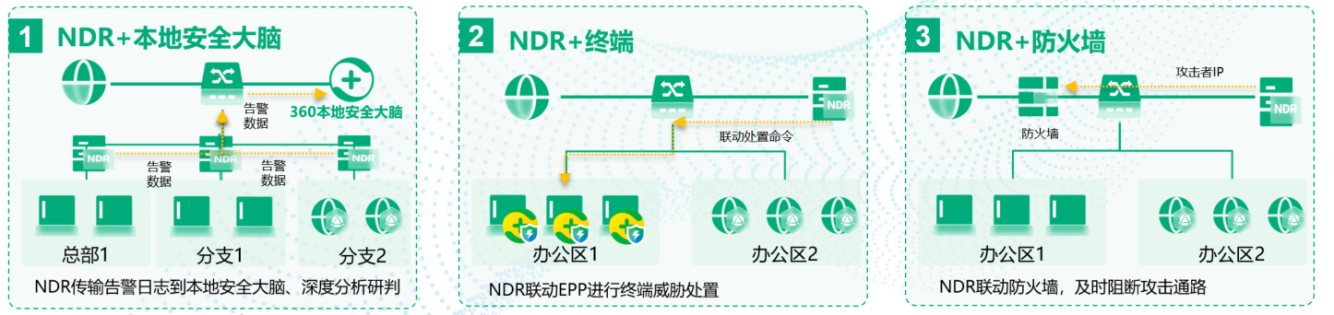 NDR支持与本地安全大脑、EPP、防火墙等联动,构建“检测—研判—阻断—隔离”闭环响应体系: