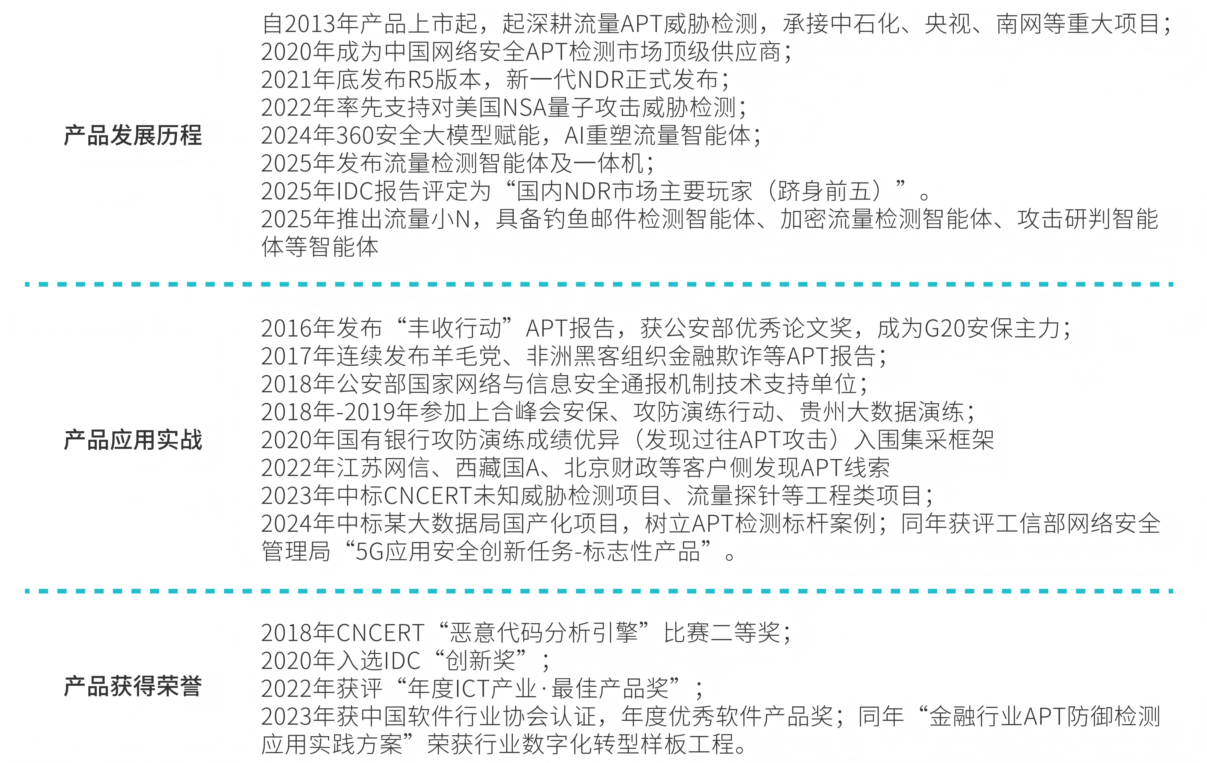 - 连续5年在攻防演练中发挥重要作用,发现1例疑似APT攻击事件,2例入侵网银成功事件,多起钓鱼邮件,成为行内APT监测主力。基于产品表现,客户开启了持续续购。