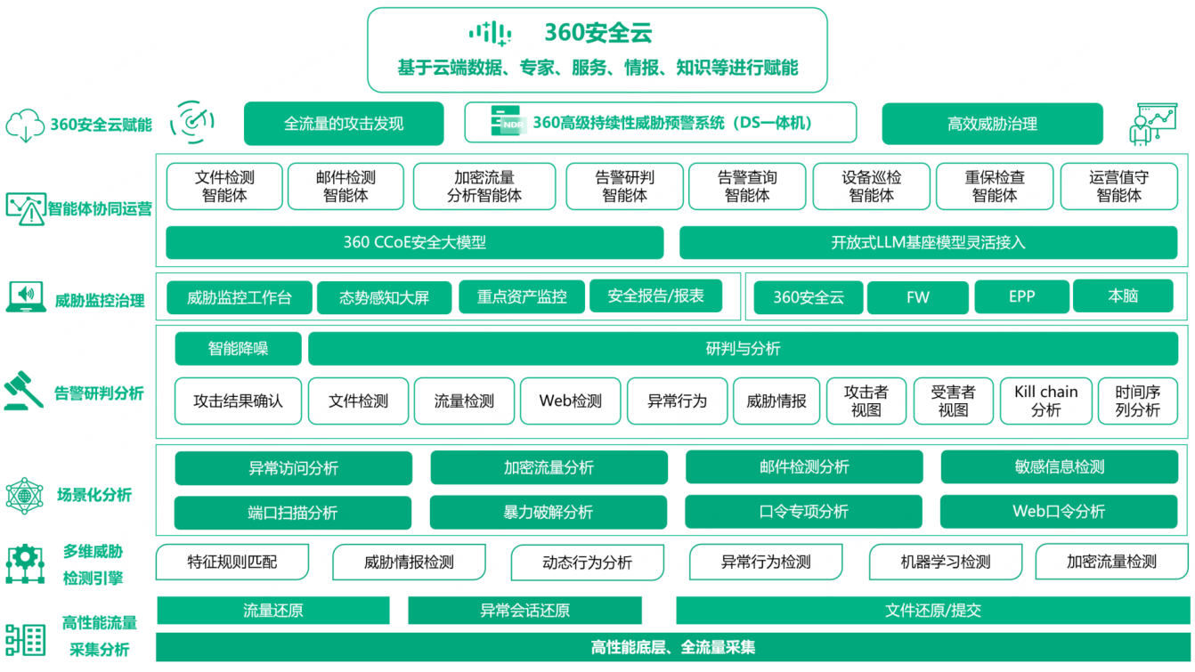 以流量为入口,融合360安全大模型,构建“数字安全专家矩阵”,覆盖告警研判、钓鱼邮件检测、加密流量分析等10+专项能力,精准对抗APT。
